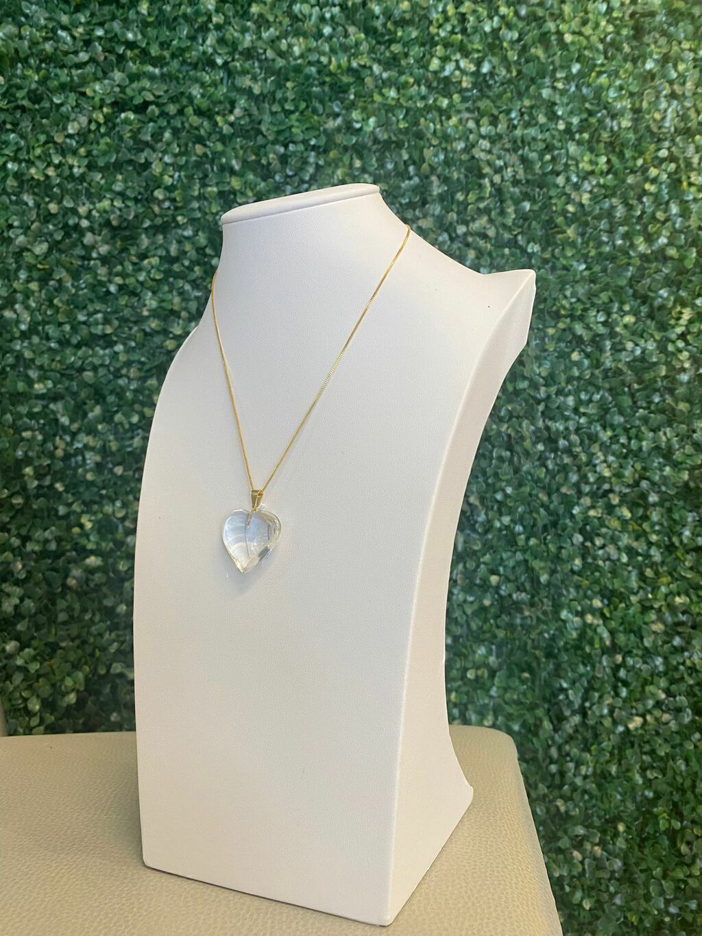 Adicione um toque de beleza e poder espiritual ao seu visual com este encantador pingente de quartzo cristal em formato de coração em metal dourado. Este pingente irradia uma energia versátil e poderosa, combinando a beleza do quartzo cristal com o brilho radiante do metal dourado.
